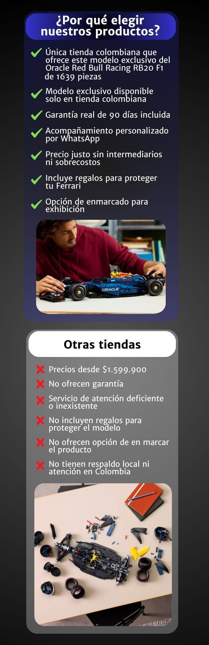 Diferencia en calidad, materiales o número de piezas respecto a la tienda oficial.